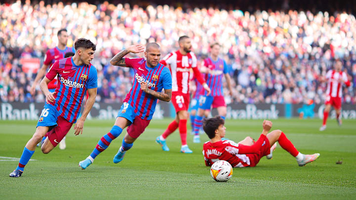 6 de febrero de 2022. La jornada 23 de LaLiga 2021-22 ha sido la primera en la que Xavi Hernández se enfrenta al Atlético de Madrid en el banquillo. Pese a que Yannick Ferreira Carrasco adelantó a los suyos, los tantos de Jordi Alba, Pablo Páez "Gavi", Ronald Araújo y Daniel Alves revirtieron un marcador que maquillaría Luis Suárez.